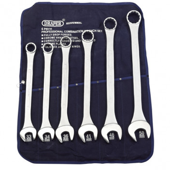 Heavy duty long pattern, fully drop forged chrome vanadium steel hardened, tempered and chrome plated. Polished rings and jaws. Supplied in heavy duty canvas wallet with tie cord.Contents: 33, 34, 36, 41, 46 and 50mm.