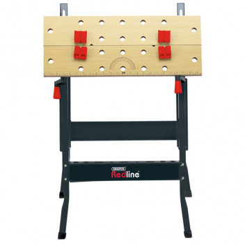 Portable workbench with dual clamping action and 12 holes for work clamping dogs. Folds flat for secure storage. Two-piece MDF worktop. Sturdy legs manufactured from strong box section steel. Maximum clamping width with dogs 240mm. Supplied with four plastic clamping dogs and fixings. Weight 5.4kg.(approx.). Flat packed with assembly instructions. Display carton.